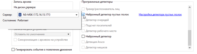 Для активации модуля необходимо в Настройках канала в области Программные детекторы выбрать пункт Нейронный детектор пустых полок и выбрать Сервер, который будет производить расчет аналитики.
