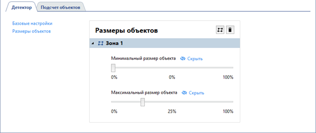 В пункте настроек Размеры объектов вы можете создать зоны, в которых будет производиться поиск пустот на полках. При помощи настроек Минимальный размер объекта и Максимальный размер объекта необходимо выбрать наибольший и наименьший размер детектируемого объекта.