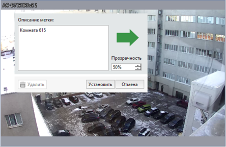 Для анализа ситуации, происходящей на видео, оператору может понадобится информация о том, что расположено на данном стеллаже, куда ведет эта дверь или др. Используя метки вы можете добавить подобную информацию непосредственно на изображение. При этом, содержимое метки будет отображаться только при наведении на нее курсора, а настраиваемая прозрачность не позволит ей закрыть изображение.