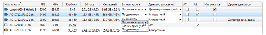 На вкладке отображается суммарная информация по всем локальным каналам системы. Информация о сетевых каналах отображается во вкладке Запись сетевых каналов настроек сервера.