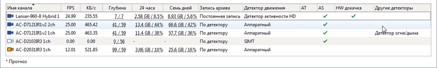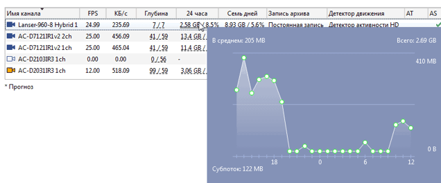 В столбцах 24 часа и Семь дней вы найдете визуальную статистику распределения/объема записей по часам/дням для каждого канала. Наведите курсор на значение и вы увидите график, по которому вы можете понять насколько интенсивно в последние 24 часа или 7 дней писался архив данного канала.