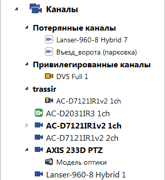 Потерянные - каналы, по которым в системе имеется архив, но регистрирующее видео устройство в системе отсутствует (удалено). Такие каналы группируются в отдельную папку Потерянные каналы.