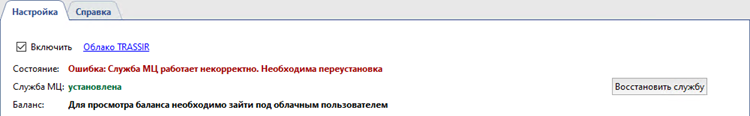 Если возникают ошибки в работе службы МЦ, то отобразится сообщение об ошибке, и станет доступна кнопка Восстановить службу, нажав которую, запустится мастер установки.