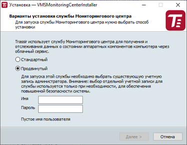 В режиме Продвинутый введите учетные данные пользователя с правами администратора, под которыми будет работать служба. В режиме Стандартный используется учетная запись текущего пользователя ОС.