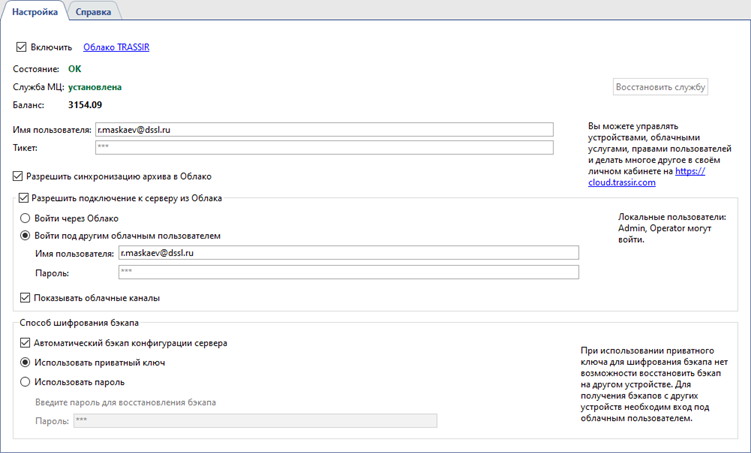 Если в работе с TRASSIR Cloud возникнут ошибки то они отобразятся в поле Состояние. В поле Баланс отображается сумма денежных средств, оставшихся на балансе учетной записи облачного пользователя, авторизованного на данном сервере.
