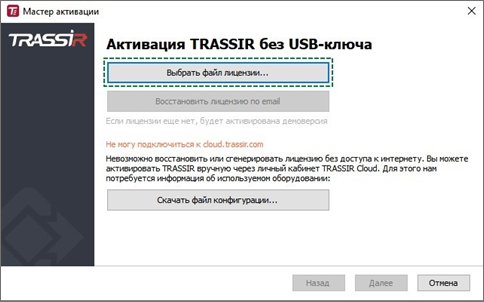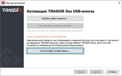 Мастер активации сообщит о невозможности связаться с облаком TRASSIR. Нажмите кнопку Скачать файл конфигурации... и сохраните файл конфигурации. Мастер активации завершит свою работу. Перенесите файл конфигурации на компьютер с доступом в Интернет.