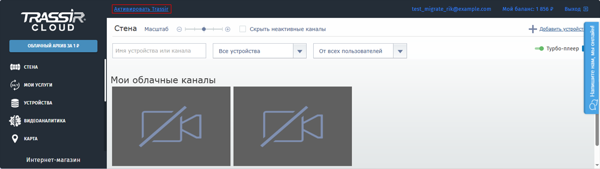 Зайдите на сайт облака под своей учетной записью. Если у вас ещё нет учетной записи, зарегистрируйтесь. Нажмите кнопку Активировать TRASSIR в верхней части страницы.