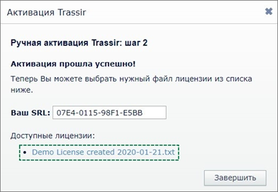 Облако проверит файл конфигурации, после чего создаст новую демолицензию или загрузит ранее созданную демолицензию. Нажмите на ссылку, чтобы скачать файл демолицензии. Перенесите файл демолицезии на компьютер с установленным ПО TRASSIR-Server.