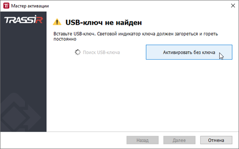 Повторно запустите ПО TRASSIR. В окне Мастера активации нажмите кнопку Активировать без ключа.