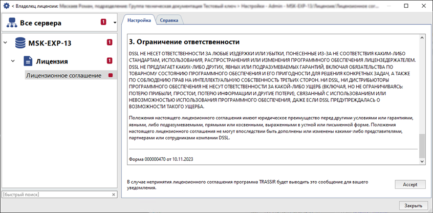 Чтобы получить доступ ко всем функциям сервера, необходимо прочитать лицензионное соглашение и подтвердить его, нажав кнопку Accept.