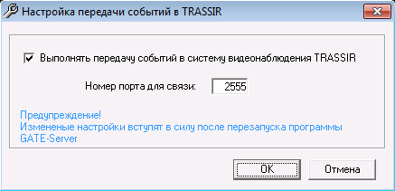 Установите флаг Выполнять передачу событий в систему видеонаблюдения и укажите Номер порта для связи, через который будет происходить передача данных от СКД "Gate" на сервер.