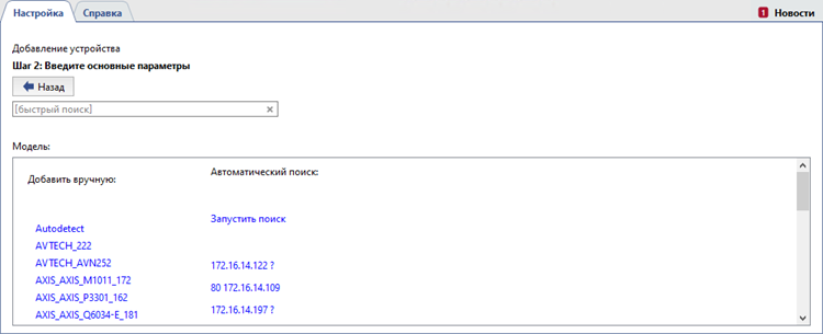 Выберите модель устройства из списка Добавить вручную. При необходимости можете воспользоваться быстрым поиском, чтобы сократить список моделей. В открывшемся окне введите данные для подключения.