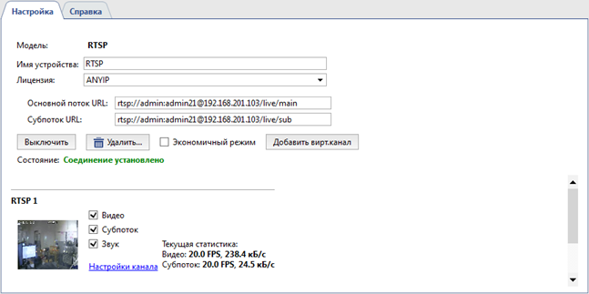 В полях Основной поток URL и Субпоток URL необходимо указать строку запроса RTSP-потока, следующего формата: