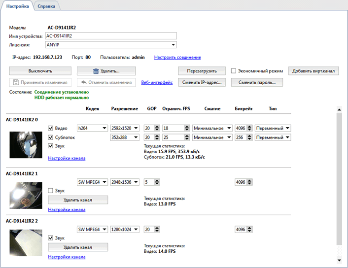 Обратите внимание, что при локальном просмотре виртуального канала отображается несжатый поток, а в архив записывается сжатый.