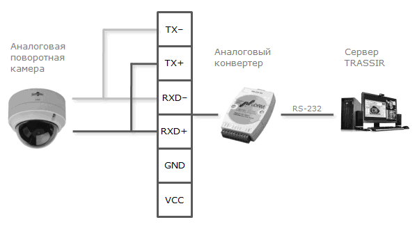 - Подключение с помощью аналогового конвертера. Для подключения через последовательный порт, понадобится преобразователь (конвертер) сигналов с камеры (RS-485) в сигналы