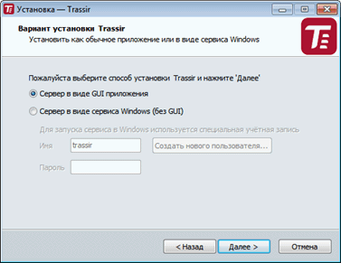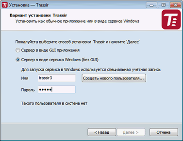 Если вы хотите установить сервер в виде сервиса Windows, то выберите вариант установки Сервер в виде сервиса Windows (без GUI) и введите данные пользователя, которые будут использоваться для запуска сервиса. Если такого пользователя не существует вы можете создать его, нажав на кнопку Создать нового пользователя....