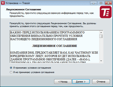 В окне Лицензионное соглашение вы можете ознакомиться с текстом лицензионного соглашения. Для продолжения установки выберите пункт Я принимаю условия соглашения и нажмите кнопку Далее.