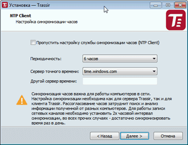 На следующем этапе мастер предложит настроить службу синхронизацию времени (NTP). Выберите периодичность синхронизации и Сервер точного времени. Вы можете указать адрес произвольного NTP-сервера или отменить настройку NTP установив флаг Пропустить настройку службы синхронизации часов (NTP Client). Нажмите кнопку Далее.