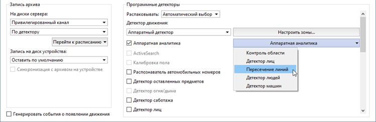 Для подключения и настройки детектора Пересечение линий необходимо в Настройках канала установить флаг Аппаратная аналитика, нажать кнопку и выбрать пункт Пересечение линий.