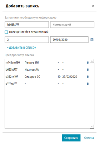 Для создания записи с ограничением по времени или количеству посещений, снимите флаг Посещение без ограничений и введите Количество посещений или Дату, до которой будет разрешён въезд. Как только одно из условий ограничения будет выполнено (истекло количество посещений или закончился срок действия разрешения на въезд), то запись будет автоматически удалена.