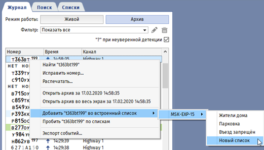 Кроме добавления записи в ручную и импорта списка из файла, номера могут быть добавлены в список с помощью скриптов и, непосредственно из журнала AutoTRASSIR/AutoPass.