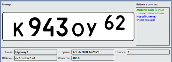 При распознавании номер в журнале событий будет выделен цветом, соответствующий типу списка, в который он добавлен. Если номер добавлен в несколько списков, то все они отобразятся в интерфейсе оператора, рядом с распознанным номером.