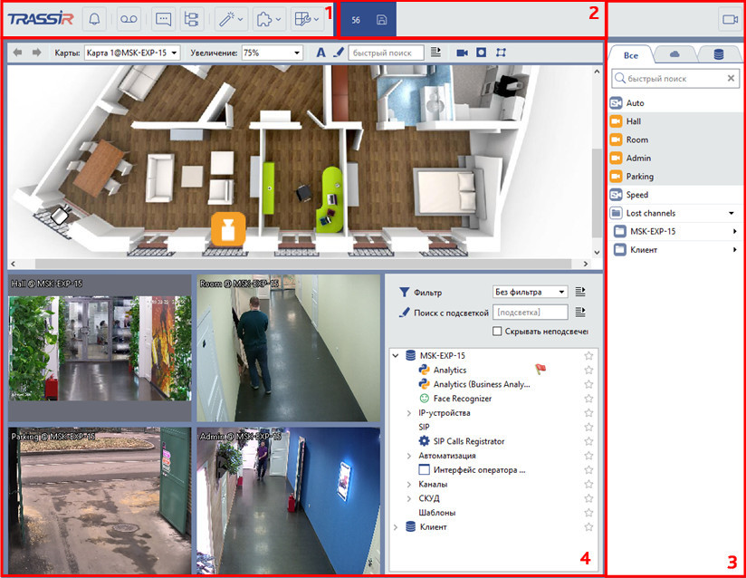 - Список каналов - область, с помощью которой можно следить за состоянием камер (а также групп камер) и, при необходимости, отображать видео с требуемой камеры на весь экран.