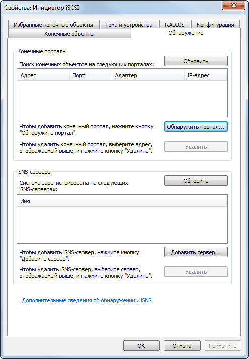 Перейдите на закладку Обнаружение и для подключения к сетевому хранилищу данных нажмите кнопку Обнаружить портал...