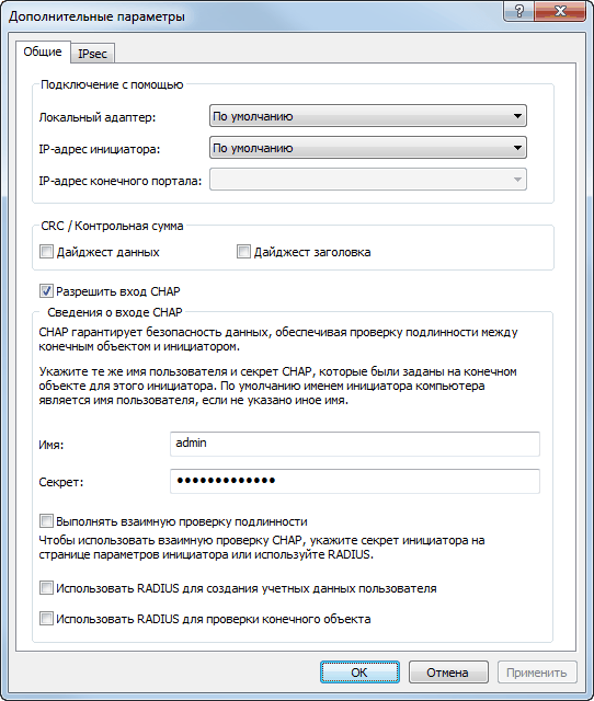Если в процессе настройки сетевого хранилища вы указывали параметры проверки подлинности CHAP, то для их ввода нажмите кнопку Дополнительно и введите те же параметры.