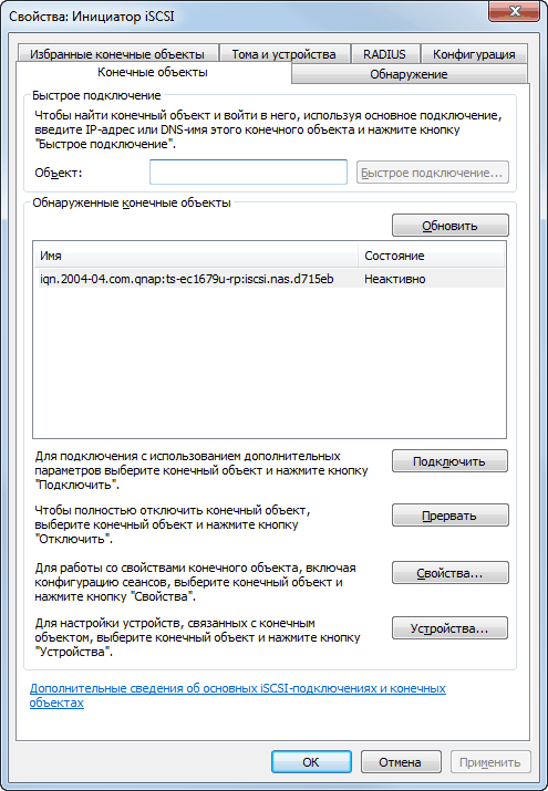 В случае успешного соединения с сетевым хранилищем его идентификатор появится на закладке Конечные объекты. При этом состояние его будет "Неактивно".