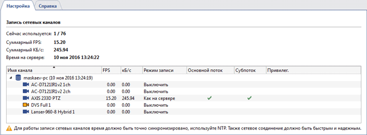Для корректной записи сетевых каналов время на серверах должно быть синхронизировано. В таблице рядом с именем сетевого сервера отображается его локальное время, если оно отличается от времени Вашего сервера, необходимо настроить синхронизацию времени по сети. Рекомендуемый период синхронизации - 2 часа.