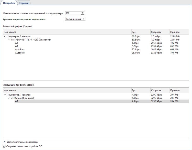 В правой части окна, отображается сетевая статистика. Вы можете видеть в режиме реального времени статистику по серверам, к которым вы подключены и по Клиентам \ Серверам подключённым к вам.