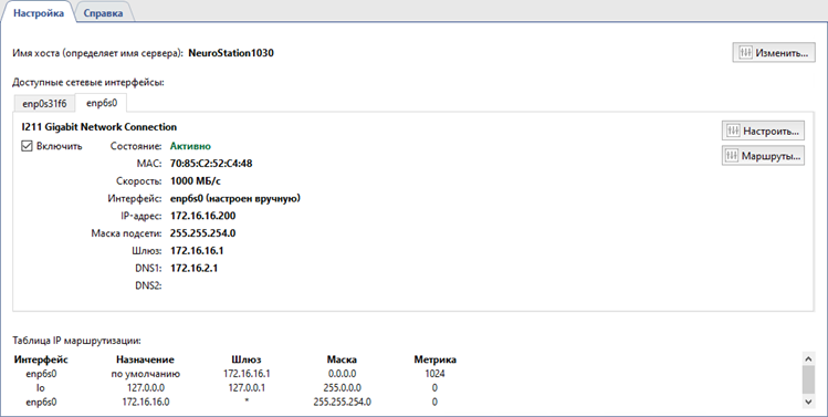 Ниже, отображается Доступные сетевые интерфейсы. На вкладках производится настройка сетевых интерфейсов, их включение и выключение.