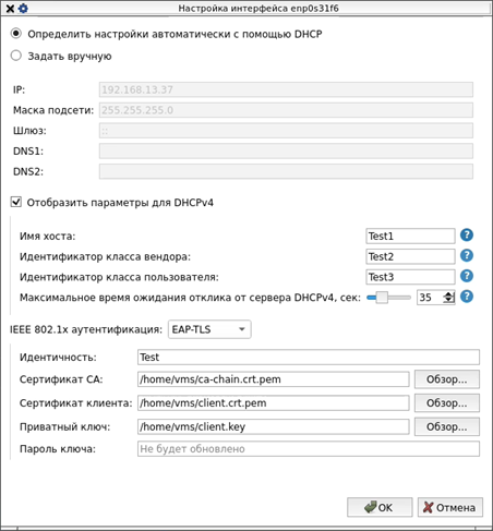 Помимо этого, для повышения безопасности сетевого подключения можно включить IEEE 802.1x аутентификацию. Для этого выберите EAP-TLS и укажите соответствующие параметры, включая сертификаты, необходимые для проверки подлинности сервера, подключающегося к сети.