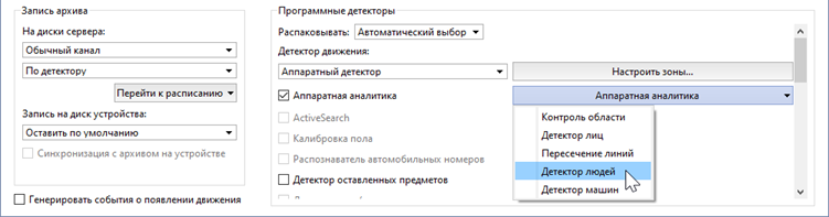 Для подключения и настройки Детектора людей необходимо в Настройках канала установить флаг Аппаратная аналитика, нажать кнопку и выбрать пункт Детектор людей.