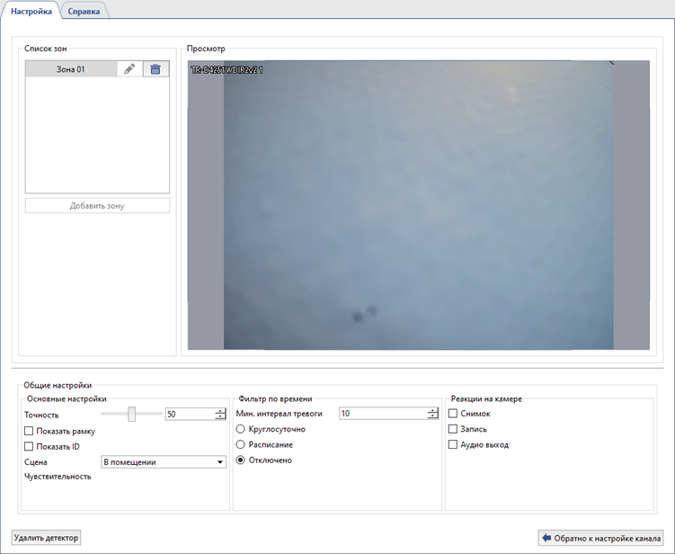 В Списке зон отображается доступная для настройки зона. Если ее нет, нажмите кнопку Добавить зону. По умолчанию зоной обнаружения определяется весь кадр. Выберите созданную зону для отображения настроек детектора.