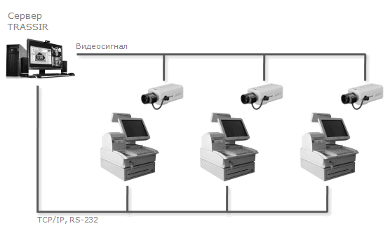 - Кассовые терминалы и сервер видеонаблюдения объединяются в локальную сеть.