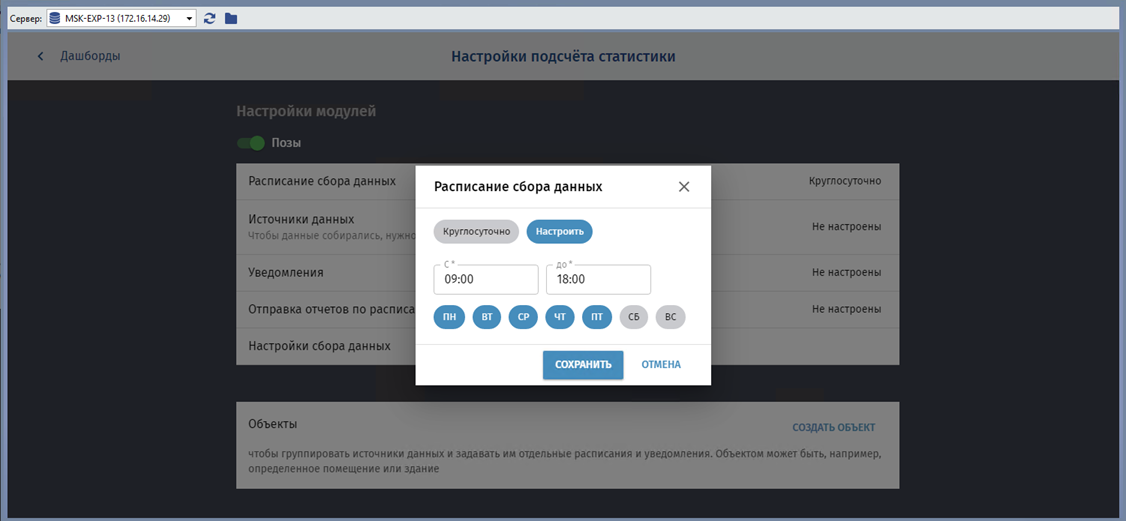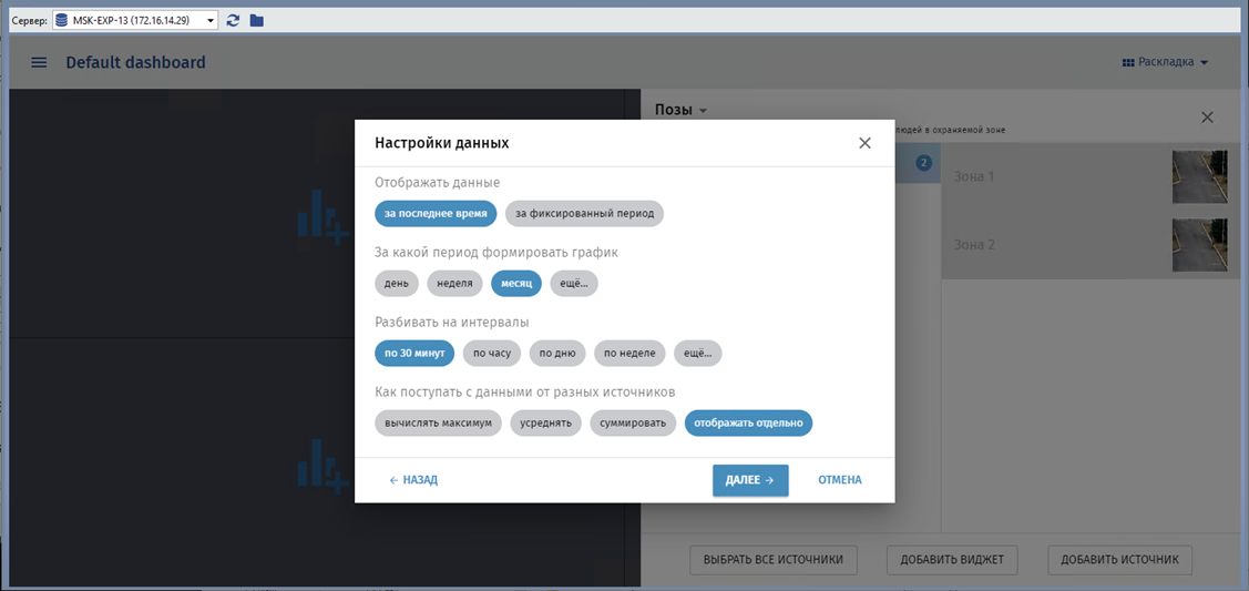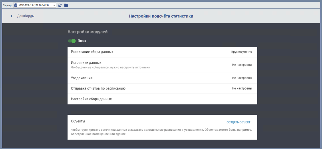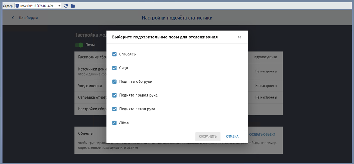Выберите пункт Настройки сбора данных и укажите позы, которые детектор будет считать подозрительными и отображать на дашборде.