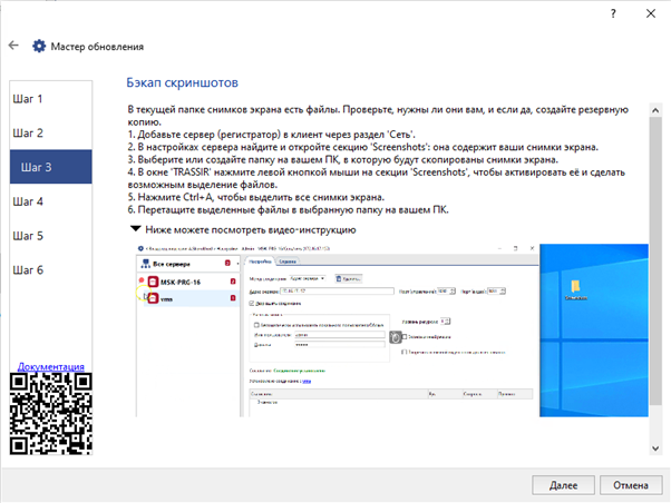 По умолчанию скриншоты и другие пользовательские файлы хранятся в папке /home/vms/shots (см. раздел Настройки локального сервера). Скопируйте их согласно инструкции в мастере обновления и нажмите кнопку Далее.