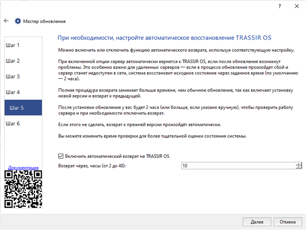 На Шаге 5 мастер обновления предложит выбрать время, в течение которого вы сможете проверить работоспособность TRASSIR OS 2.0.