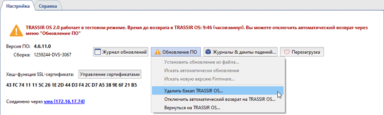 Пункт Удалить бекап TRASSIR OS... завершает тестовый период работы TRASSIR OS 2.0 и удаляет бекап предыдущей ОС. После перезагрузки на сервере будет запущена TRASSIR OS 2.0 и возврат к TRASSIR OS станет недоступен.
