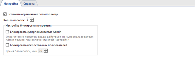 Если вы хотите применить настройки блокировки к пользователю Admin, то включите флаг Блокировать суперпользователя Admin.