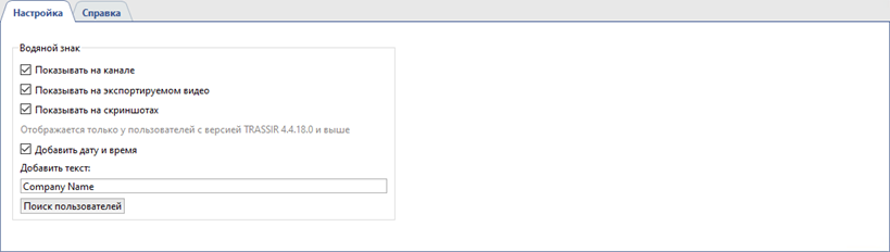 Включить отображение водяного знака на видео и настроить его вид может только пользователь Admin или пользователь, у которого включено право Настройка у объекта Водяной знак.