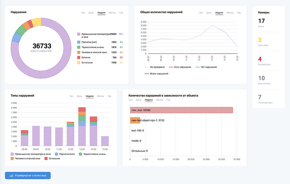 - Полная картина нарушений Детальная статистика по типам, зонам, объектам и времени. Вы точно понимаете, где, когда и какие нарушения происходят чаще всего.