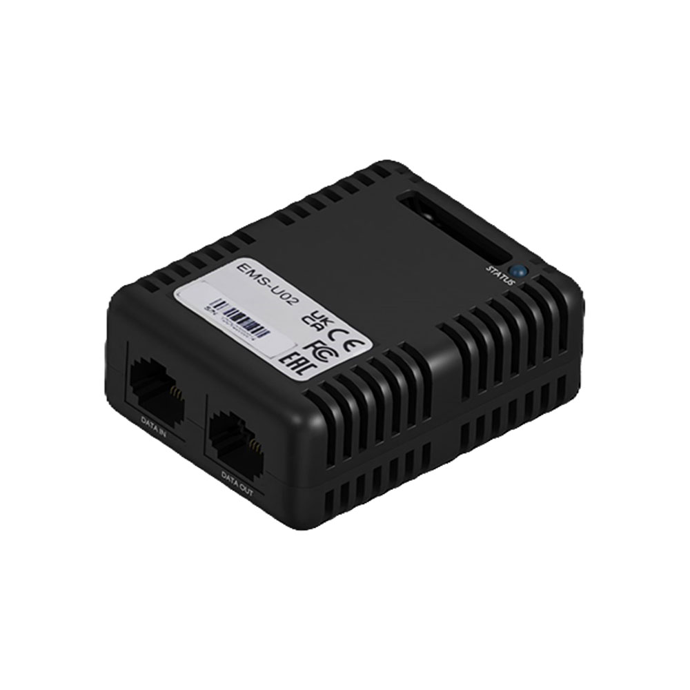 Датчик температуры и влажности «Сайбер Электро» EMS-U02 подключается к SNMP-модулю управления питанием. Укомплектован четырьмя входами (сухие контакты), одним выходом, двумя портами RJ-45.