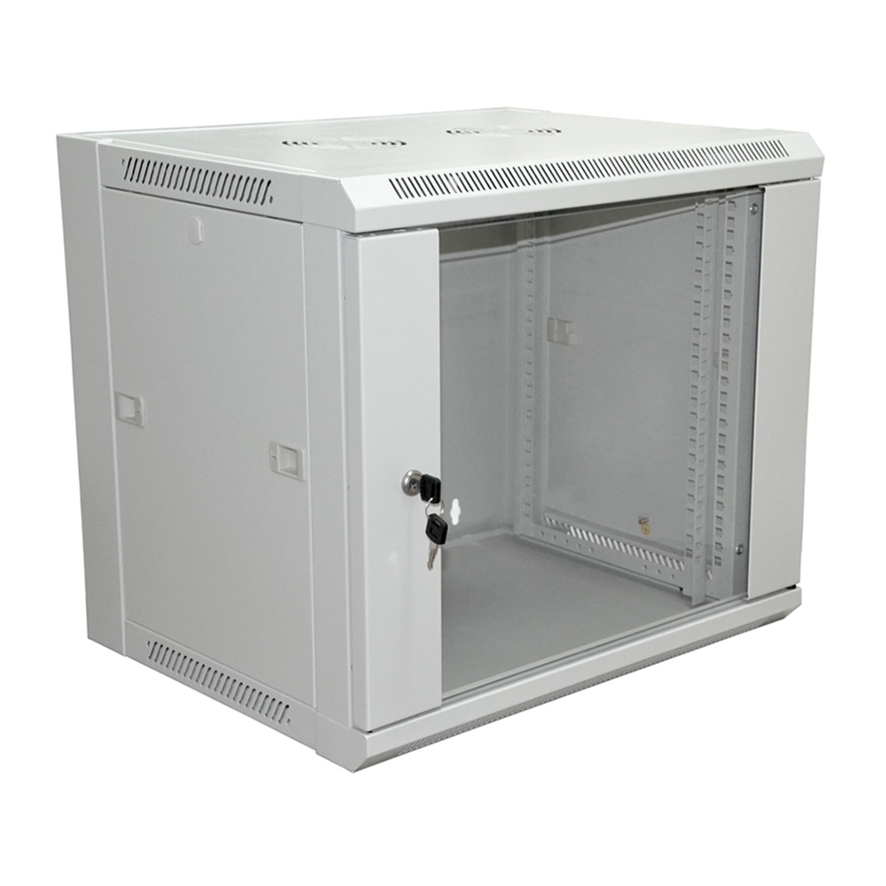 Односекционный настенный шкаф Rexant 04-2201 предназначен для компактного размещения 19-дюймового телекоммуникационного, серверного и слаботочного оборудования высотой 9U. Прочный корпус из листовой стали толщиной 1.5 мм выдерживает нагрузку до 90 кг и защищён порошковым покрытием RAL7035, устойчивым к механическому воздействию и коррозии. Передняя дверь из 5-мм тонированного ударопрочного стекла в металлической раме оснащена замком и может навешиваться с любой стороны, обеспечивая радиус открытия 220°, а съёмные боковые панели на защёлках упрощают доступ к аппаратуре при монтаже и обслуживании. В крыше предусмотрены съёмные панели под вентиляторный модуль, верхняя и нижняя стенки снабжены по два кабельных ввода для удобной разводки линий. Пара вертикальных направляющих 19″ с разметкой в юнитах гарантирует точное позиционирование устройств; для тяжёлых блоков в комплект входят два опорных уголка. Внутренние габариты шкафа составляют 570 × 450 × 500 мм (Ш × Г × В), степень защиты IP20, предусмотрены заземляющие соединения. Поставляется изделие в разобранном виде в одном гофрокоробе, что снижает стоимость транспортировки и облегчает подъём на объект.