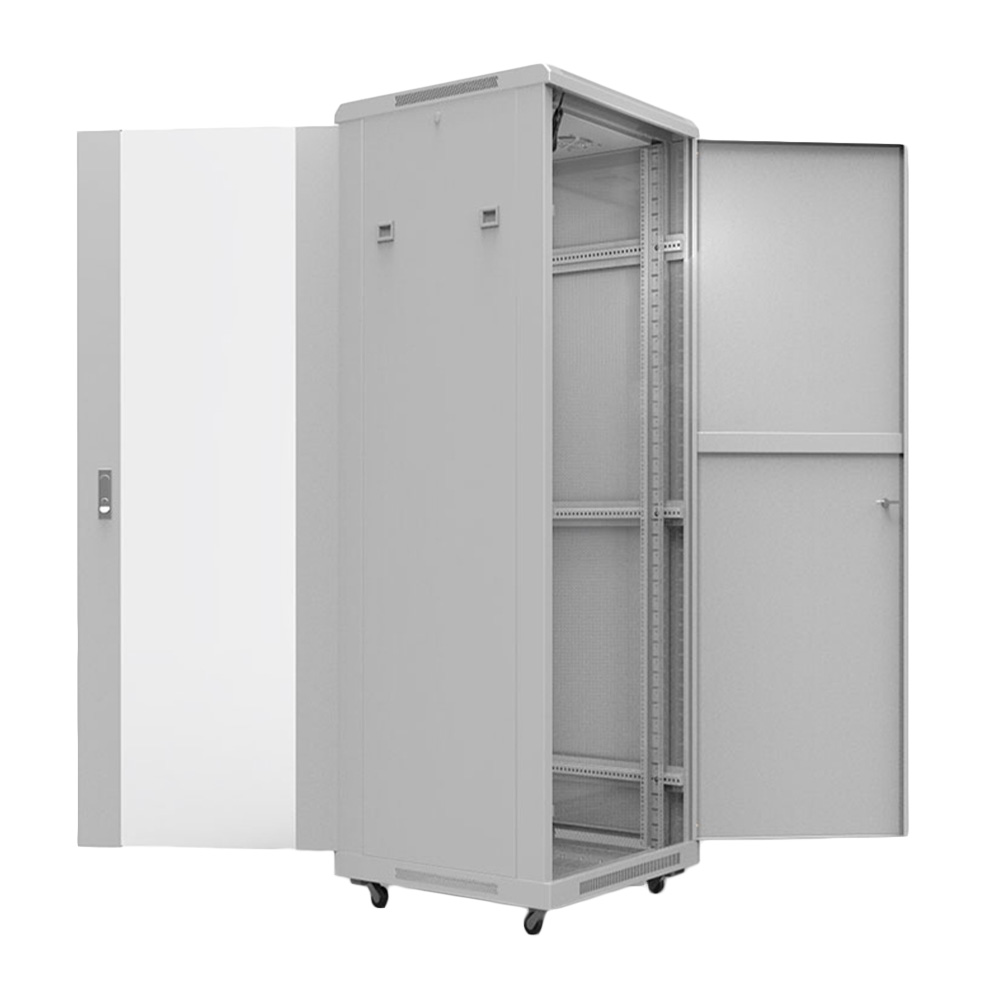 Напольный шкаф Rexant 04-2313 предназначен для установки активного и пассивного 19″ оборудования высотой 22U. Каркас изделия изготовлен из стальной стали толщиной 2 мм, задняя дверь, крышка и дно — 1,2 мм, что обеспечивает прочность конструкции и позволяет размещать аппаратуру общей массой до 800 кг. Передняя дверь выполнена из 5-мм тонированного ударопрочного стекла в металлической раме и закрывается на замок; задняя металлическая дверь также оснащена замком с откидной ручкой. Обе дверцы можно навешивать на любую сторону, угол открытия достигает 220°. Съёмные боковые панели на защёлках дают свободный доступ к установленным устройствам, а крышка снабжена панелями под вентиляторный модуль. Верх и низ корпуса имеют съёмные вводные панели для аккуратного завода кабелей. Внутри установлены две пары 19″ направляющих, регулируемых по глубине, со шкалой юнитов для точного позиционирования оборудования; регулируемые опоры входят в комплект. Полезная глубина монтажа составляет 520 мм. Шкаф поставляется в разобранном виде в двух гофрокоробах, что уменьшает расходы на логистику и упрощает подъём на объект. Светло-серое порошковое покрытие RAL7035 с предварительным фосфатированием устойчиво к износу и коррозии. Степень защиты корпуса — IP20.