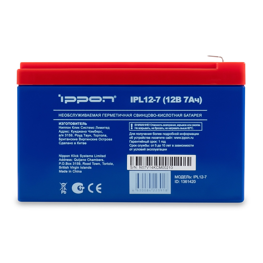 Аккумуляторная батарея для ибп IPPON 1361420 предназначена для обеспечения резервным питанием систем охраны и безопасности, телекоммуникационного оборудования, промышленных объектов широкого назначения, а также для работы в источниках бесперебойного питания. Батарея рассчитана на питание с напряжением 12 В и имеет емкость 7 Ач (номинальная емкость 7,00 А/ч — 20 часов, 10,4 А, 1,80 В/элемент). Конструкция и технологии батарей IPPON нацелены на надежную работу в режиме ожидания: технология обработки пластин и применение более толстых пластин используются для продления срока службы и снижения скорости коррозии, технология рекомбинации кислорода не требует технического обслуживания. Уникальная конструкция вентиляционного клапана контролирует потерю воды, предотвращает попадание воздуха и искры внутрь. Заявлен срок службы 8-10 лет (при температуре 20°С), гарантийный срок — 1 год.