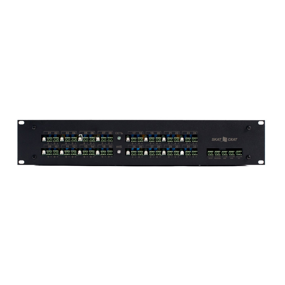 ИБП СКАТ 2150 SKAT-VM.32 RACK — источник питания в корпусе для установки в 19" шкаф (высота 2U) с распределением питания по множеству линий: 32 выхода по 0,5 А или 16 выходов по 1 А (при объединении пары выходов). Для каждого канала предусмотрены фильтрация помех и независимая регулировка выходного напряжения, диапазон плавной регулировки каждой пары выходов — от 11,8 до 15,2 В. Реализована электронная защита выходов от перегрузки по току, включая короткое замыкание, с восстановлением нормального режима после устранения перегрузки, а также защита нагрузки от повышенного выходного напряжения (свыше 18 В). Устройство работает от сети 220 В, 50 Гц и автоматически переходит на резервное питание от АКБ при снижении/отключении сети; поддерживается заряд АКБ и контроль их наличия, предусмотрена защита от перегрева и от неправильного подключения (переполюсовки) клемм АКБ. Для подключения внешней индикации и/или управления автоматикой предусмотрены 5 релейных информационно-диагностических выходов.