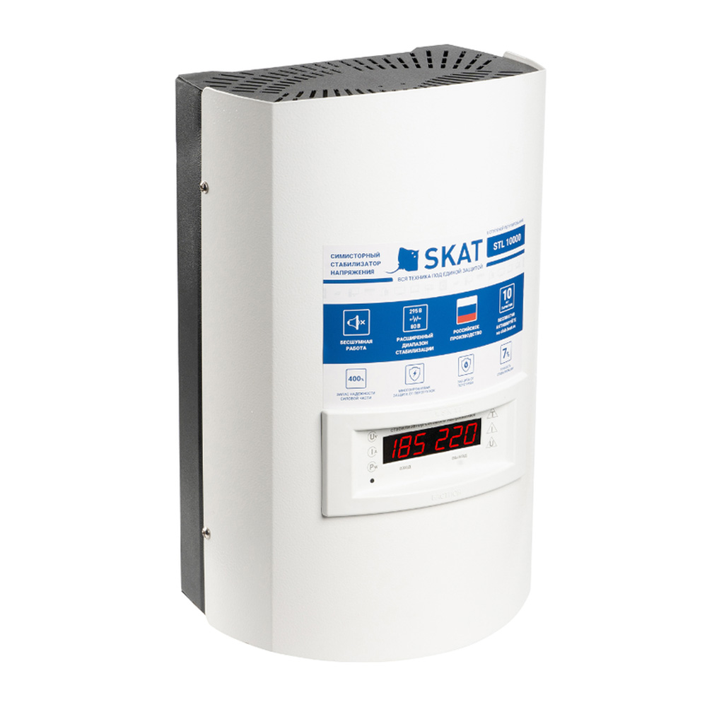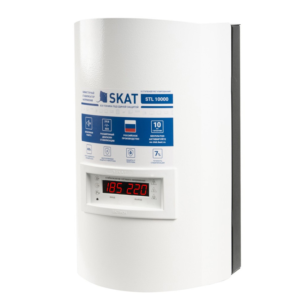 Стабилизатор напряжения СКАТ 779 Skat STL 10000 исп. Н предназначен для поддержания выходного напряжения на одном уровне и защиты подключенной бытовой техники от скачков и провалов в электросети. Это электронный стабилизатор на симисторных ключах управления с цифровой индикацией и бесшумным переключением ступеней за счет системы естественного охлаждения без вентилятора. Работает в широком диапазоне стабилизации от 120 до 280 В в штатном режиме и поддерживает расширенный диапазон входного напряжения 80...295 В (с меньшей точностью стабилизации). Технология ZERO-CROSS обеспечивает переключение ступеней в точке перехода синусоиды через ноль, уменьшая помехи на выходе. Реализованы защита от перегрева (4 температурных датчика), тройная защита от перегрузки и короткого замыкания (независимое реле отключения, автоматический выключатель, 2 датчика тока), а также система самодиагностики с отображением причины аварийного отключения нагрузки. Заявлено российское производство и 100% выходной контроль качества.